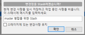소스트리 위쪽에 있는 스태시 클릭하여, 메시지 입력하고 확인을 누른다.