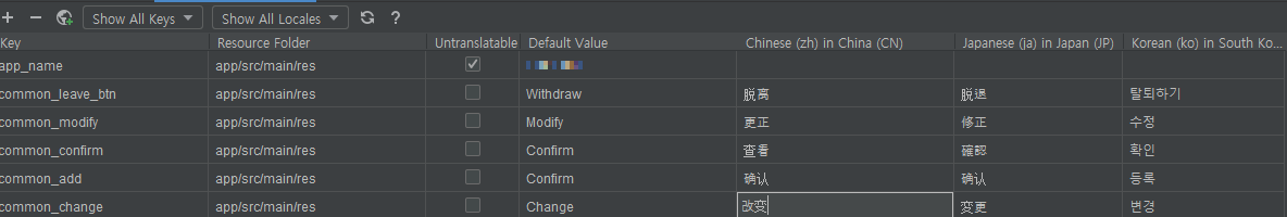 앱 이름이나, key 같은 언어에 따라 안바뀌는 string 값들은 Untranslatable을 체크해주면 된다.