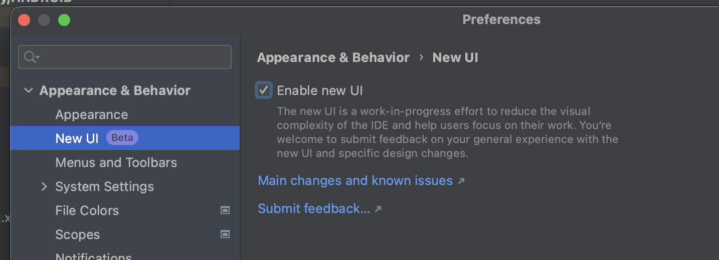 맥 기준 Preferencec > New UI 에서 Enable new UI를 해주면 된다.